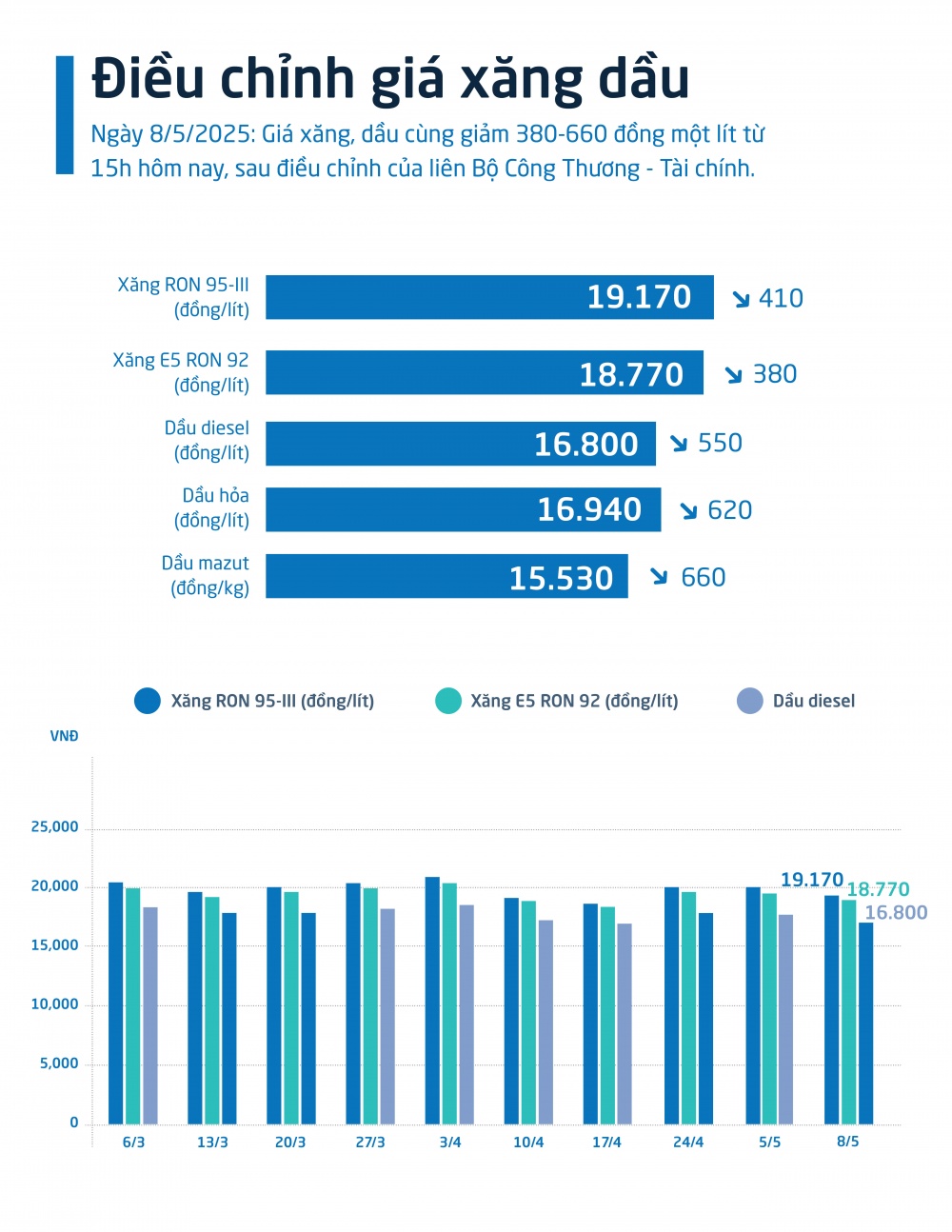 [Infographic] Giá xăng RON 95 giảm 410 đồng, còn 19.170 đồng/lít