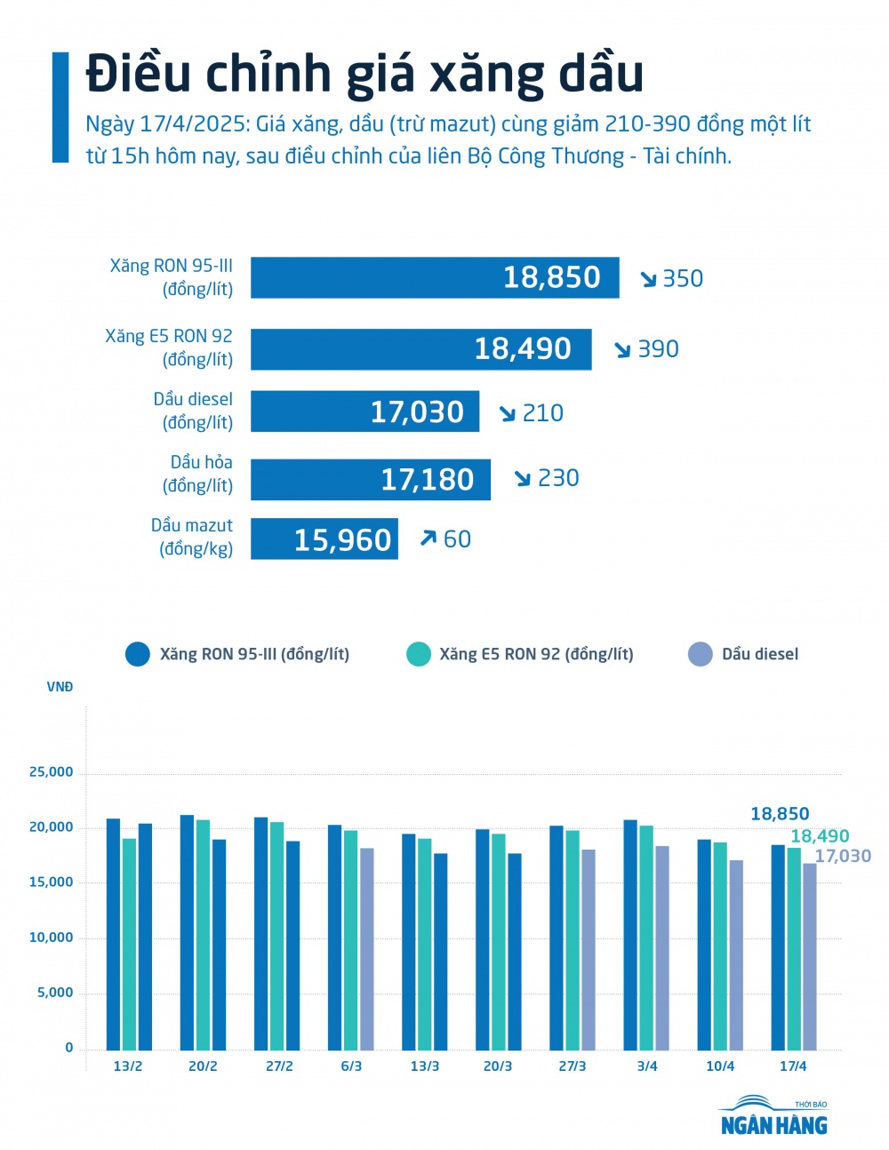 Từ 15h ngày 17/4, giá xăng dầu trong nước đồng loạt giảm theo điều hành của liên Bộ Công Thương - Tài chính. Xăng RON 95-III giảm 350 đồng/lít, còn 18.850 đồng, mức thấp nhất trong 5 năm qua. Xăng E5 RON 92 giảm 390 đồng, dầu diesel và dầu hỏa lần lượt giảm 210-230 đồng/lít. Riêng dầu mazut tăng 60 đồng/kg.
