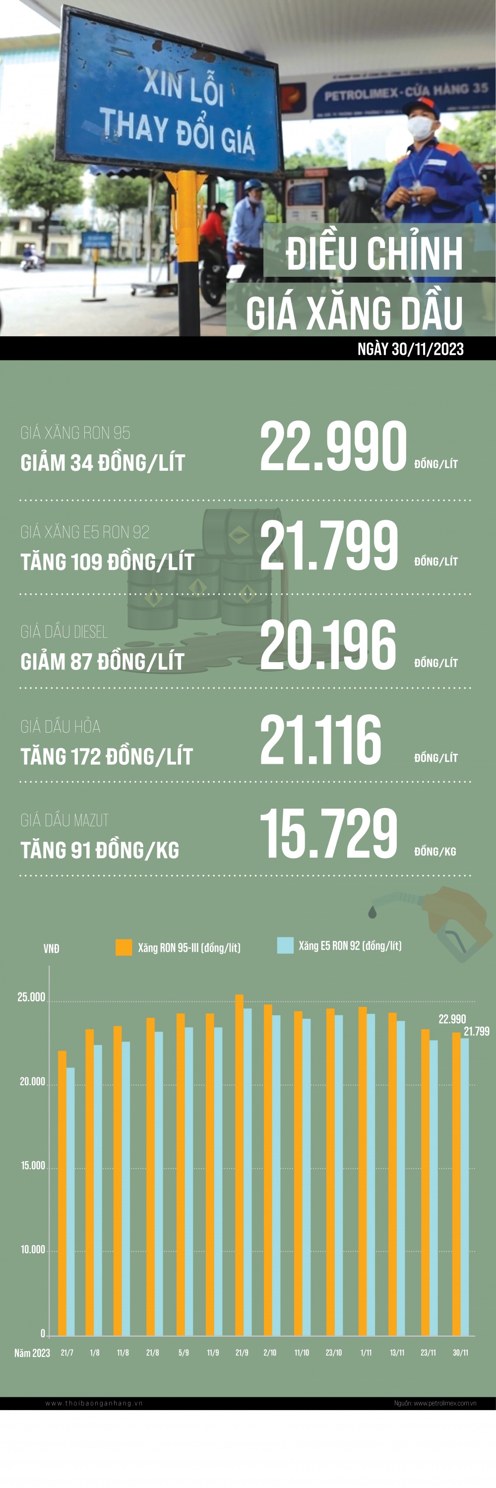 Trong lần điều hành ngày 30/11, giá xăng RON 95 được điều chỉnh giảm theo xu hướng thế giới, trong khi xăng E5 RON 92 tăng nhẹ. Giá dầu diesel giảm nhẹ 87 đồng/lít.