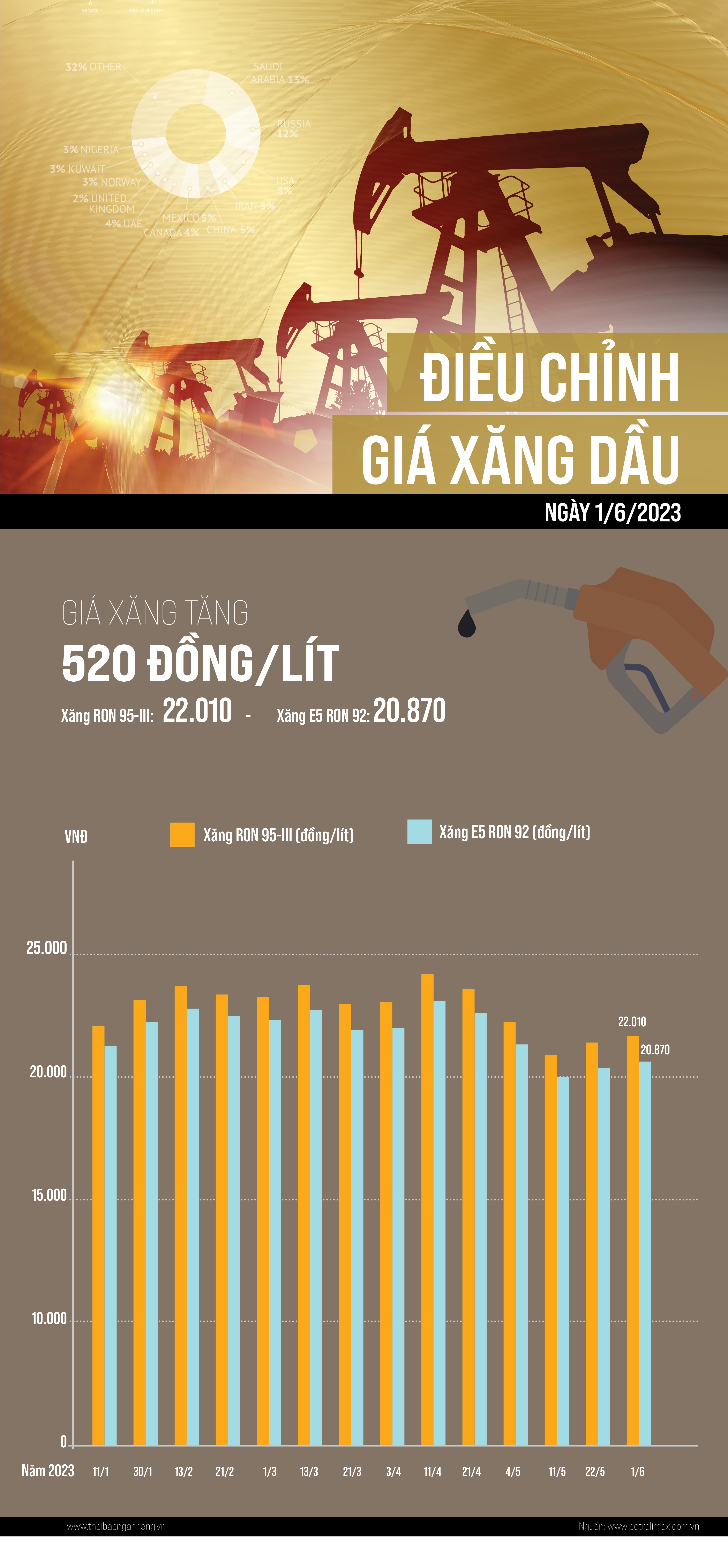 [Infographic] Giá xăng RON 95 vượt 22.000 đồng/lít