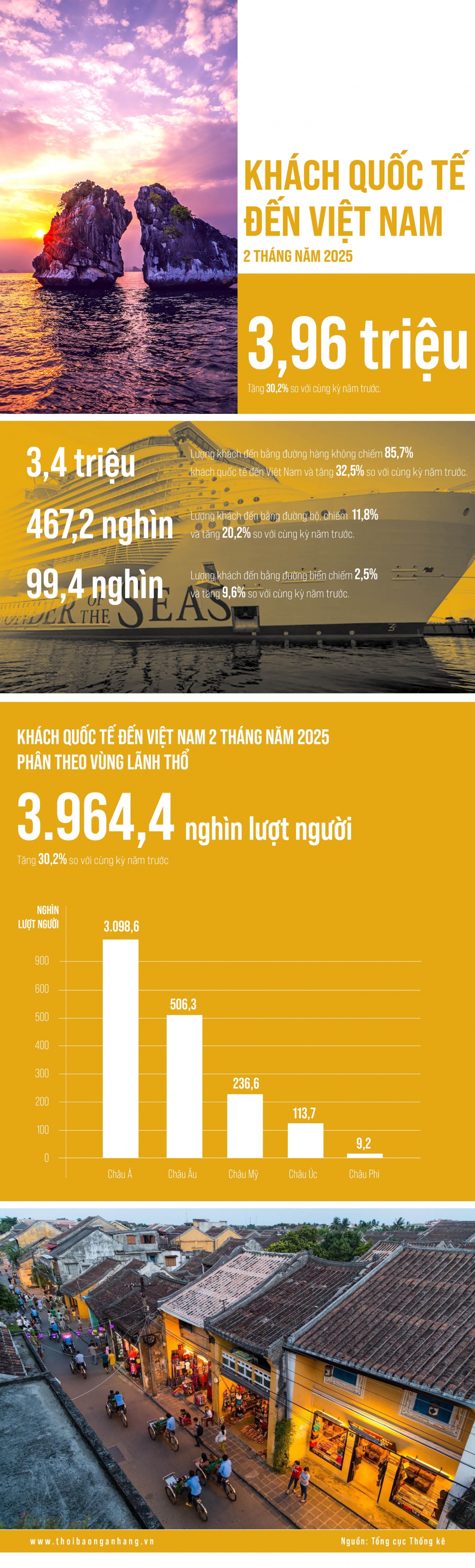 Chính sách thị thực thuận lợi, quảng bá du lịch hiệu quả và loạt giải thưởng quốc tế đã giúp lượng khách quốc tế đến Việt Nam bứt phá. Hai tháng đầu năm 2025, Việt Nam đón hơn 3,96 triệu lượt khách, tăng 30,2% so với cùng kỳ năm trước, trong đó khách đến bằng đường hàng không chiếm 85,7%.