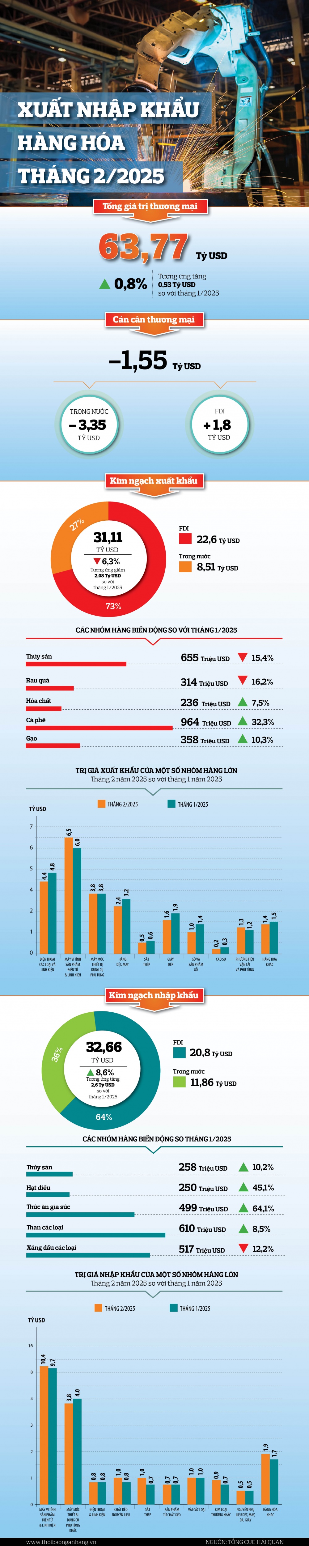 [Infographic] Kim ngạch xuất nhập khẩu tháng 2 đạt 63,77 tỷ USD