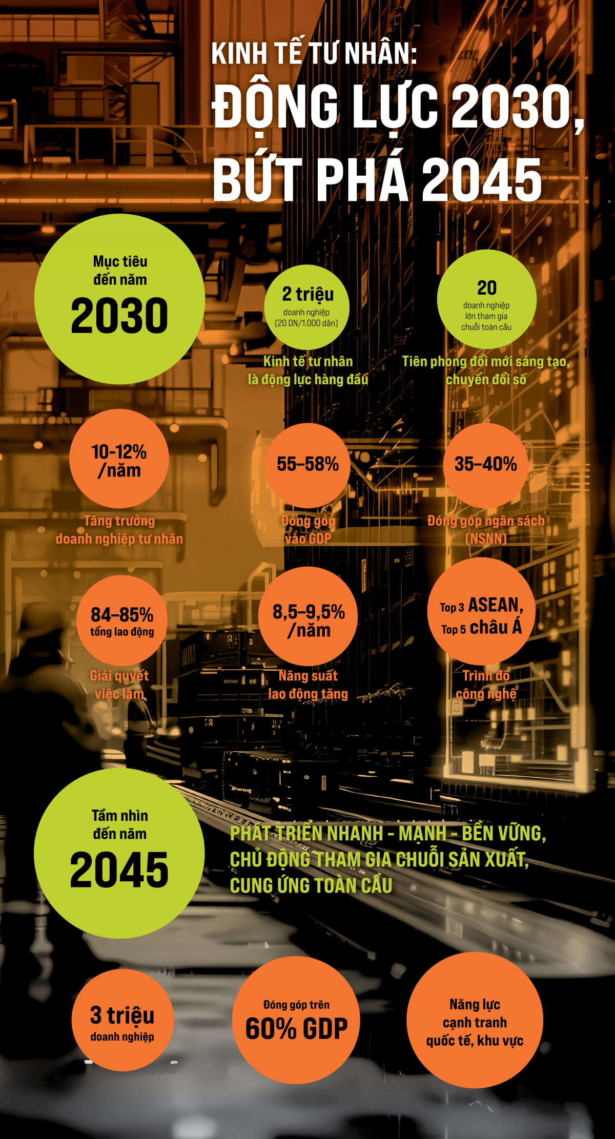 Đến năm 2030, kinh tế tư nhân sẽ trở thành một trong những động lực quan trọng nhất của nền kinh tế, với mục tiêu đạt 2 triệu doanh nghiệp, đóng góp 55-58% GDP và giải quyết tới 85% việc làm. Tầm nhìn đến 2045, khu vực này sẽ phát triển bền vững, có 3 triệu doanh nghiệp, đóng góp trên 60% GDP và chủ động tham gia chuỗi cung ứng toàn cầu.