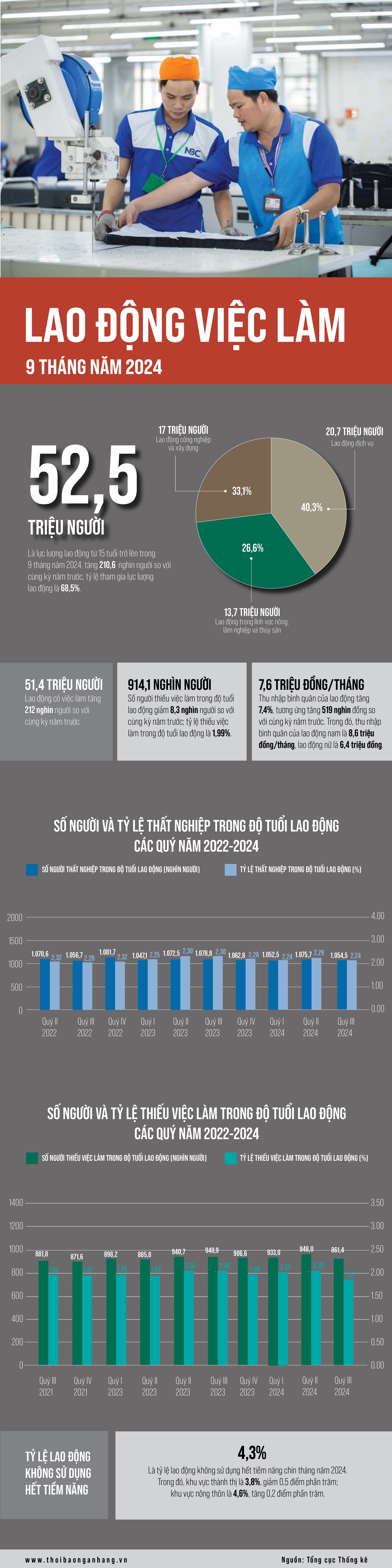9 tháng năm 2024, lực lượng lao động từ 15 tuổi trở lên là 52,5 triệu người, tăng 210,6 nghìn người so với cùng kỳ năm trước; lao động có việc làm là 51,4 triệu người, tăng 212 nghìn người; thu nhập bình quân tháng của người lao động tăng 519 nghìn đồng; tỷ lệ thất nghiệp là 2,26%, giảm 0,02 điểm phần trăm và tỷ lệ thiếu việc làm trong độ tuổi lao động là 1,99%, giảm 0,03 điểm phần trăm.