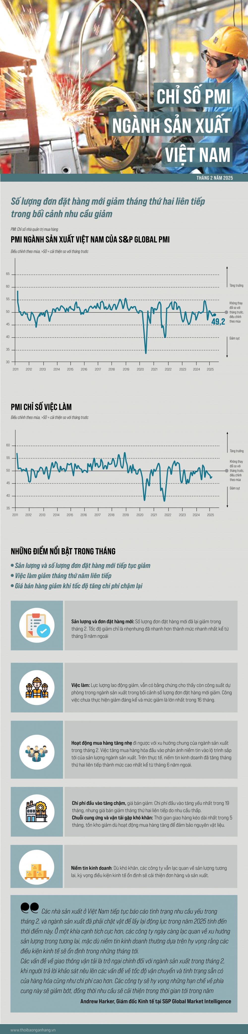 Ngành sản xuất Việt Nam tiếp tục đối mặt với nhiều khó khăn trong tháng 2/2025 khi nhu cầu yếu khiến đơn hàng và sản lượng giảm, đẩy chỉ số PMI dưới ngưỡng 50 điểm tháng thứ ba liên tiếp. Dù vậy, các doanh nghiệp vẫn giữ vững niềm tin vào sự phục hồi trong tương lai, kỳ vọng điều kiện kinh tế ổn định sẽ thúc đẩy tăng trưởng và cải thiện chuỗi cung ứng đang gặp trở ngại.