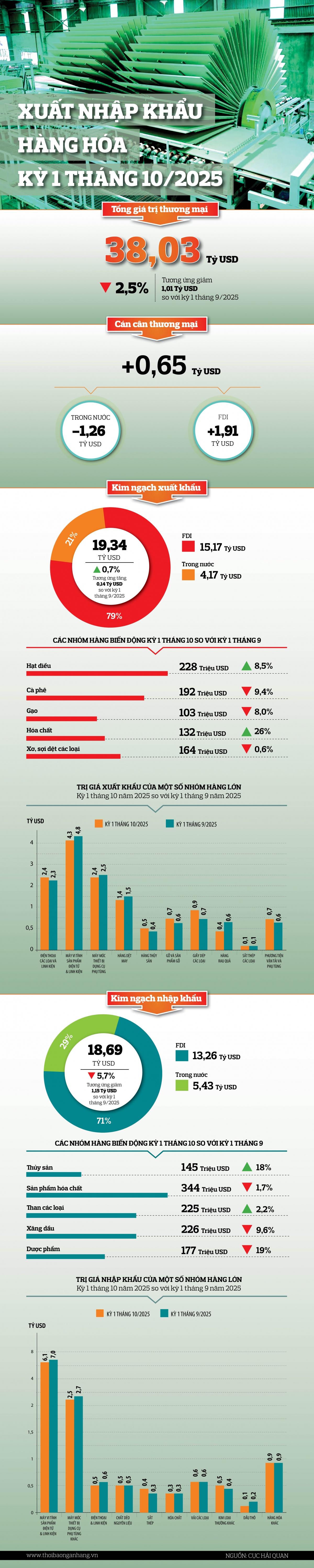 Theo số liệu thống kê của Cục Hải quan, tổng trị giá xuất nhập khẩu hàng hóa của Việt Nam trong kỳ 1 tháng 10/2025 (từ ngày 1-15/10/2025) đạt 38,03 tỷ USD, giảm 2,5% (tương ứng giảm 1,01 tỷ USD) so với nửa đầu tháng 9/2025.