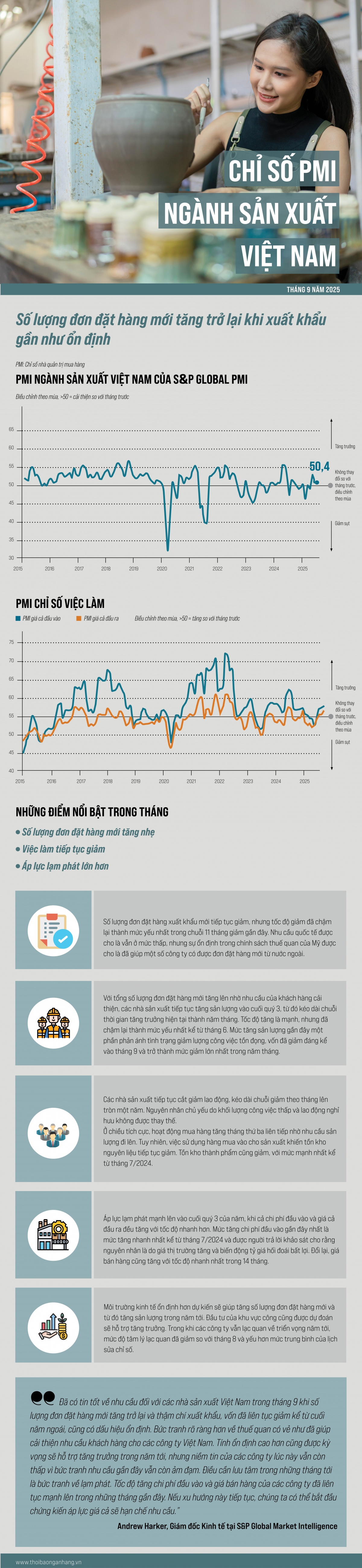PMI sản xuất Việt Nam tháng 9 đạt 50,4 điểm, nối dài chuỗi ba tháng mở rộng. Đơn hàng mới và sản lượng tăng là tín hiệu tích cực, củng cố kỳ vọng ngành sản xuất sẽ tiếp tục đóng góp quan trọng vào mục tiêu tăng trưởng kinh tế 8,3 - 8,5% trong năm 2025.