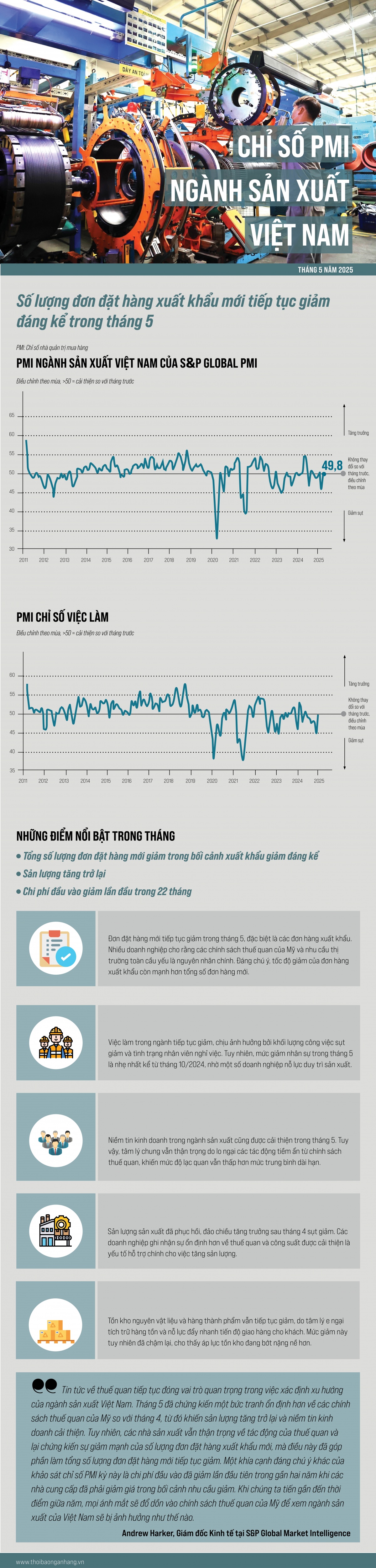 Chỉ số nhà quản trị mua hàng (PMI) ngành sản xuất Việt Nam tăng lên 49,8 điểm trong tháng 5, tiến sát ngưỡng ổn định sau khi chạm mức thấp 45,6 điểm vào tháng 4. Mặc dù đơn đặt hàng mới, đặc biệt từ thị trường xuất khẩu, tiếp tục giảm do tác động của thuế quan và nhu cầu yếu, sản lượng đã phục hồi nhờ chính sách thuế ổn định hơn và năng lực sản xuất được cải thiện. Đây là tín hiệu tích cực cho thấy các nhà sản xuất đang từng bước thích ứng, trong bối cảnh chi phí đầu vào giảm lần đầu sau gần hai năm, kéo theo giá bán tiếp tục được điều chỉnh xuống.