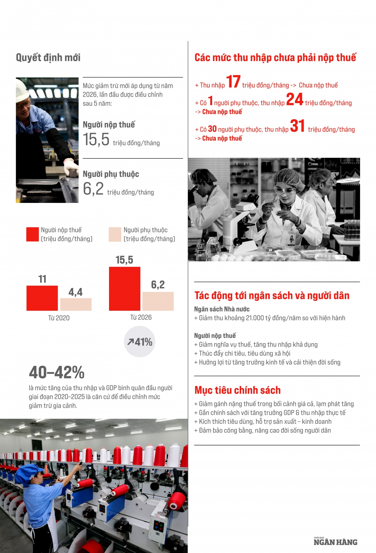Từ năm 2026, người nộp thuế được giảm trừ 15,5 triệu đồng/tháng, người phụ thuộc 6,2 triệu đồng, góp phần giảm nghĩa vụ thuế và tăng thu nhập thực cho người dân.
