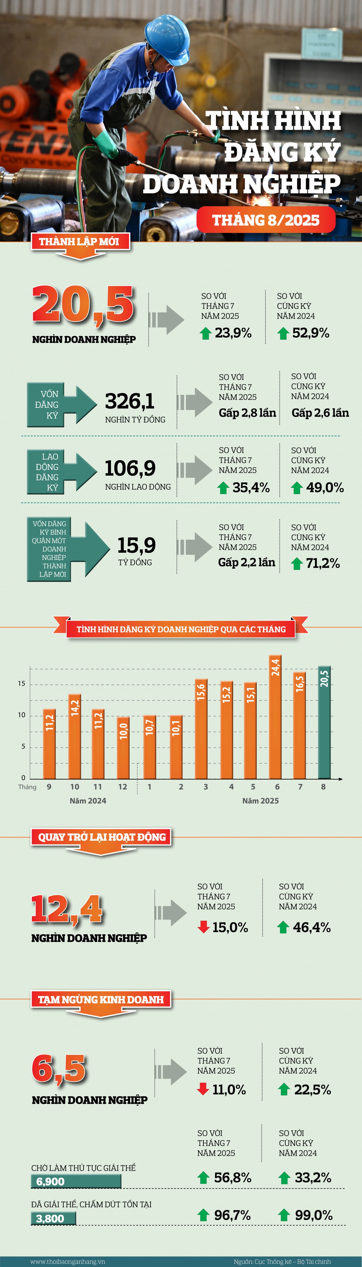 Trong tháng 8, cả nước ghi nhận 20,5 nghìn doanh nghiệp thành lập mới với vốn đăng ký 326,1 nghìn tỷ đồng, đều tăng mạnh so với tháng 7 và cùng kỳ năm trước. Bên cạnh đó, có 12,4 nghìn doanh nghiệp quay trở lại hoạt động, trong khi số doanh nghiệp tạm ngừng và giải thể cũng gia tăng.