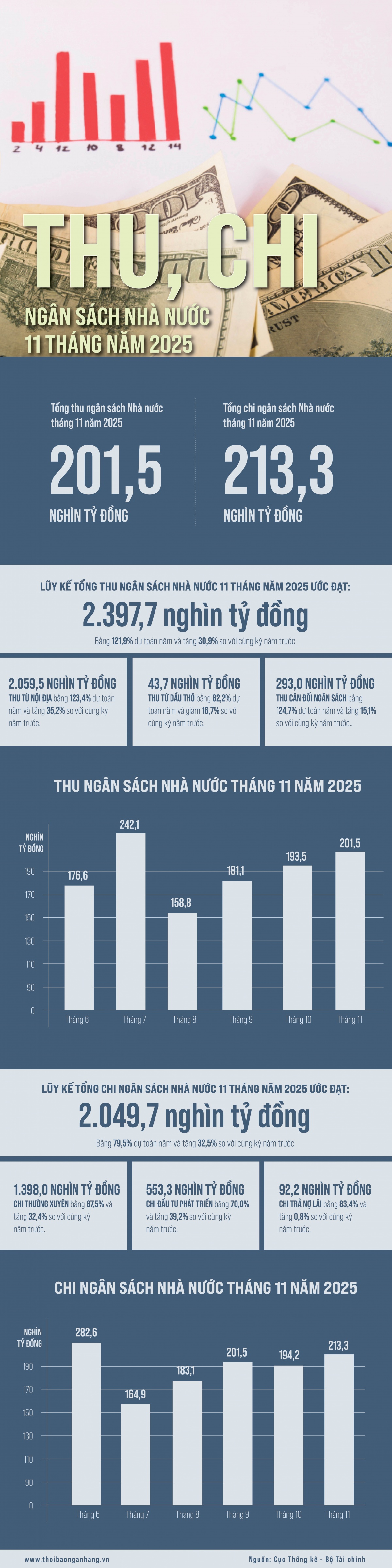Ngân sách Nhà nước ghi nhận kết quả tích cực trong 11 tháng năm 2025 khi tổng thu đạt 2.397,7 nghìn tỷ đồng, vượt 121,9% dự toán và tăng gần 31% so với cùng kỳ. Tổng chi ước 2.049,7 nghìn tỷ đồng, tăng 32,5%, với chi thường xuyên và chi đầu tư phát triển tăng mạnh.