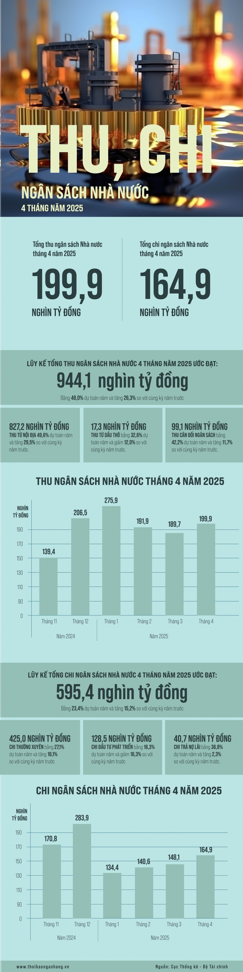 Bốn tháng đầu năm 2025, tổng thu ngân sách Nhà nước ước đạt 944,1 nghìn tỷ đồng, bằng 48,0% dự toán năm và tăng 26,3% so với cùng kỳ năm trước; trong đó, thu nội địa tăng 29,5%, thu từ hoạt động xuất, nhập khẩu tăng 11,7%. Chi ngân sách Nhà nước ước đạt 595,4 nghìn tỷ đồng, bằng 23,4% dự toán năm và tăng 15,2%, bảo đảm các nhu cầu phát triển kinh tế - xã hội, quốc phòng, an ninh, thanh toán nợ đến hạn và chi trả đúng quy định cho các đối tượng.