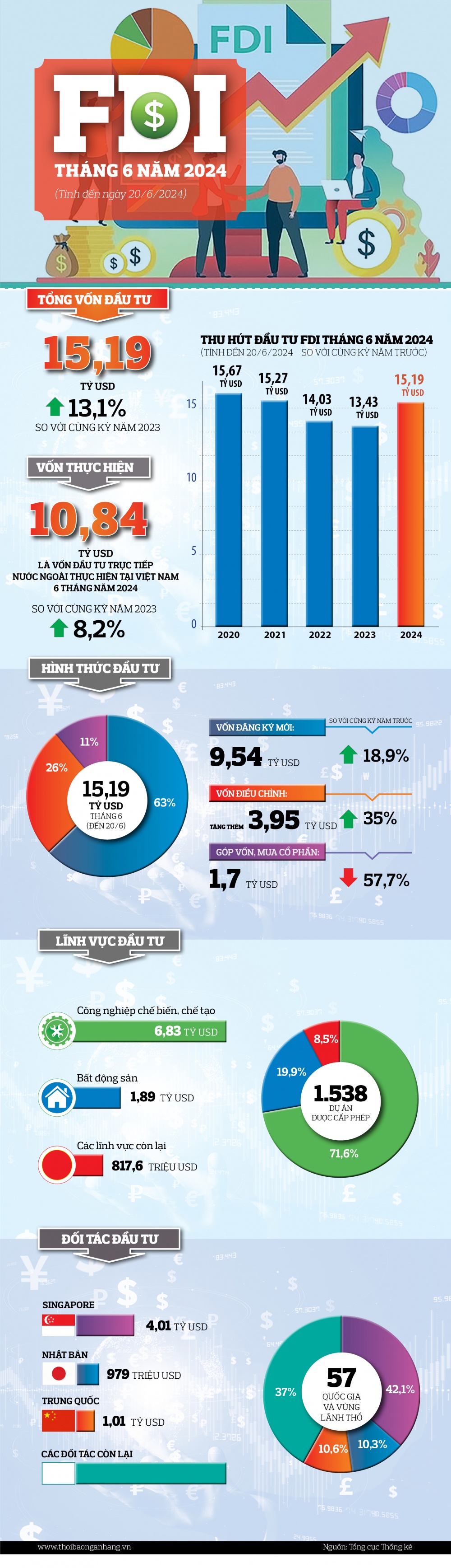 Tổng vốn đầu tư nước ngoài đăng ký vào Việt Nam tính đến ngày 20/6/2024 bao gồm: Vốn đăng ký cấp mới, vốn đăng ký điều chỉnh và giá trị góp vốn, mua cổ phần của nhà đầu tư nước ngoài đạt gần 15,19 tỷ USD, tăng 13,1% so với cùng kỳ năm trước.