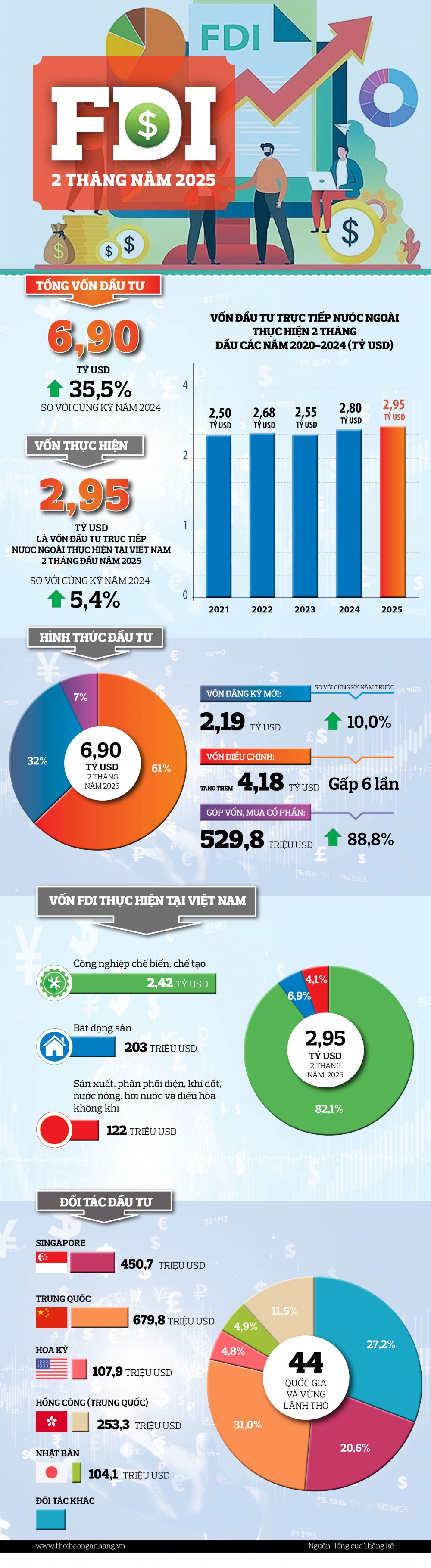 Đầu năm 2025, vốn đầu tư trực tiếp nước ngoài (FDI) vào Việt Nam đạt gần 6,9 tỷ USD, tăng 35,5% so với cùng kỳ năm trước. Dòng vốn tập trung chủ yếu vào công nghiệp chế biến, chế tạo và bất động sản, với sự góp mặt mạnh mẽ từ các nhà đầu tư Trung Quốc, Singapore và Hồng Kông. Đặc biệt, vốn điều chỉnh tăng gấp 6 lần, cho thấy niềm tin và kỳ vọng cao của nhà đầu tư nước ngoài vào thị trường Việt Nam.