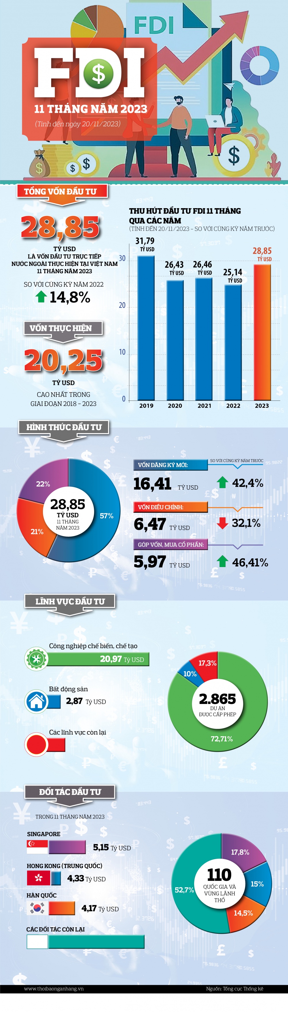 Tính từ đầu năm đến ngày 20/11/2023, tổng vốn đăng ký cấp mới, điều chỉnh và góp vốn mua cổ phần, mua phần vốn góp của nhà đầu tư nước ngoài đạt gần 28,85 tỷ USD, tăng 14,8% so với cùng kỳ năm ngoái. Vốn thực hiện của các dự án FDI đạt 20,25 tỷ USD, cao nhất trong giai đoạn 2018 - 2023.