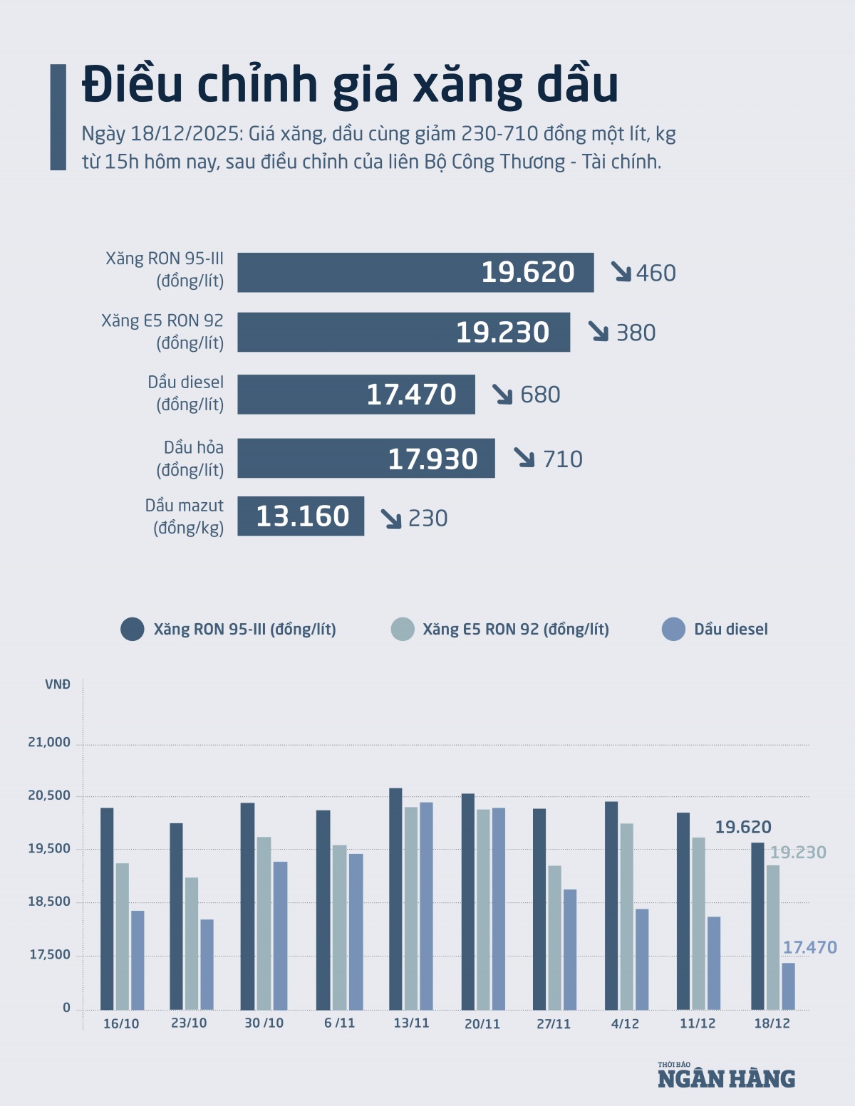 Sau điều chỉnh của liên Bộ Công Thương - Tài chính, giá xăng RON 95-III giảm 460 đồng, E5 RON 92 giảm 380 đồng, trong khi các mặt hàng dầu giảm sâu nhất tới 710 đồng mỗi lít, kg. Góp phần kéo giảm chi phí nhiên liệu cho người tiêu dùng.