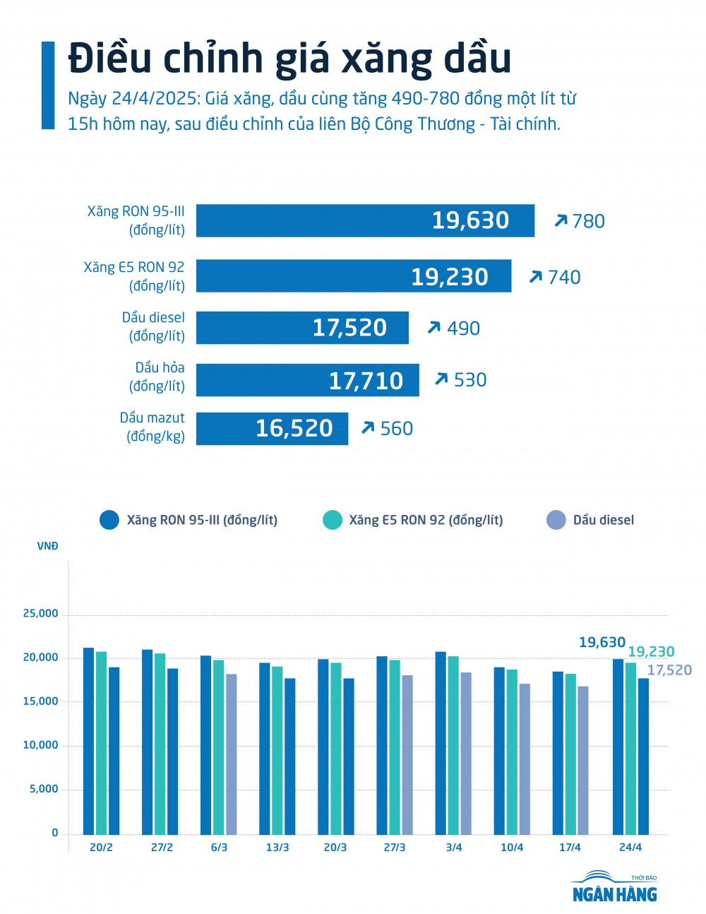 Chiều 24/4, giá xăng dầu đồng loạt tăng sau kỳ điều chỉnh của liên Bộ Công Thương - Tài chính. Xăng RON 95-III tăng mạnh 780 đồng, lên 19,630 đồng mỗi lít, trong khi E5 RON 92 tăng 740 đồng, lên 19,230 đồng. Các mặt hàng dầu cũng ghi nhận mức tăng 490-560 đồng/lít, đưa giá dầu diesel lên 17,520 đồng, dầu hỏa 17,710 đồng và dầu mazut đạt 16,520 đồng/kg.