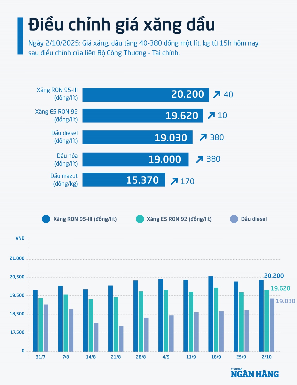 Giá xăng, dầu trong nước vừa được điều chỉnh tăng 40–380 đồng/lít, kg, đưa xăng RON 95-III lên 20.200 đồng/lít, dầu diesel 19.030 đồng/lít. Nguyên nhân do giá xăng dầu thế giới tuần qua đi lên khi OPEC+ tăng sản lượng và căng thẳng địa chính trị tiếp diễn.