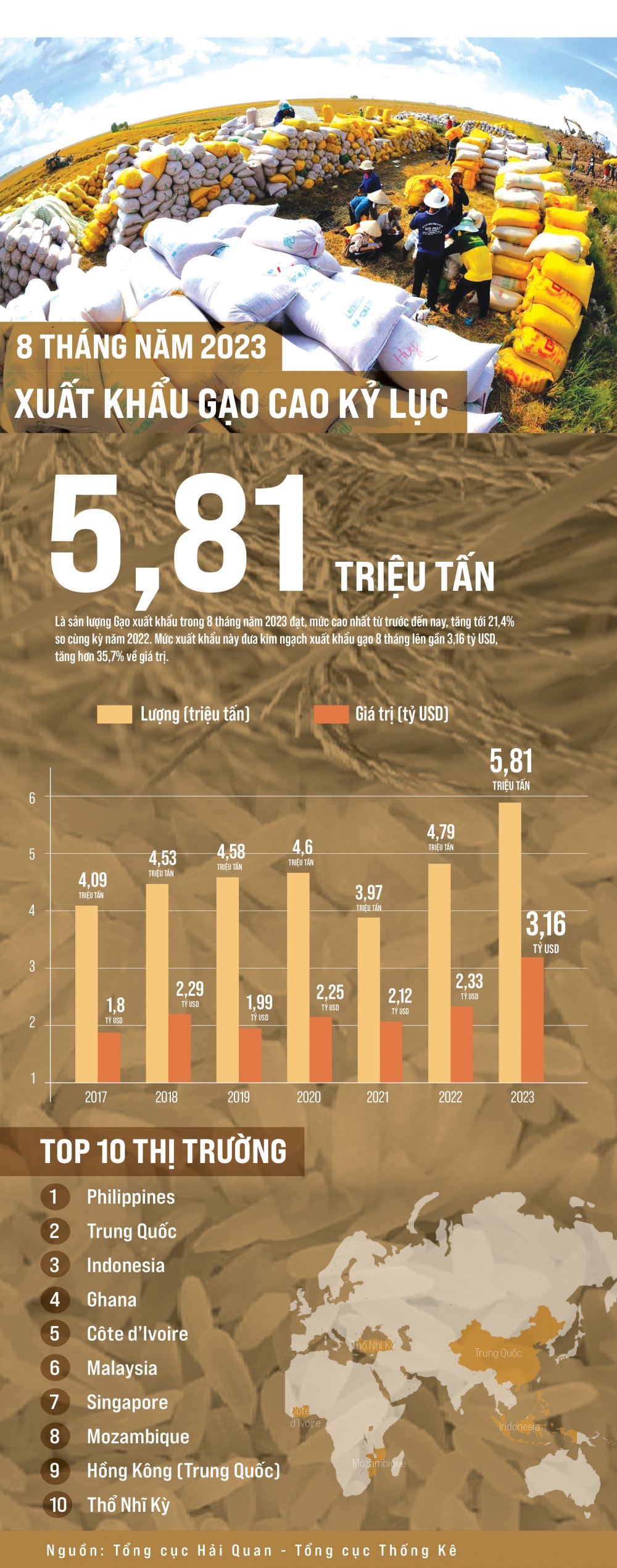 Xuất khẩu gạo trong 8 tháng năm 2023 đạt 5,81 triệu tấn, mức cao nhất từ trước đến nay, tăng tới 21,4% so cùng kỳ năm 2022.