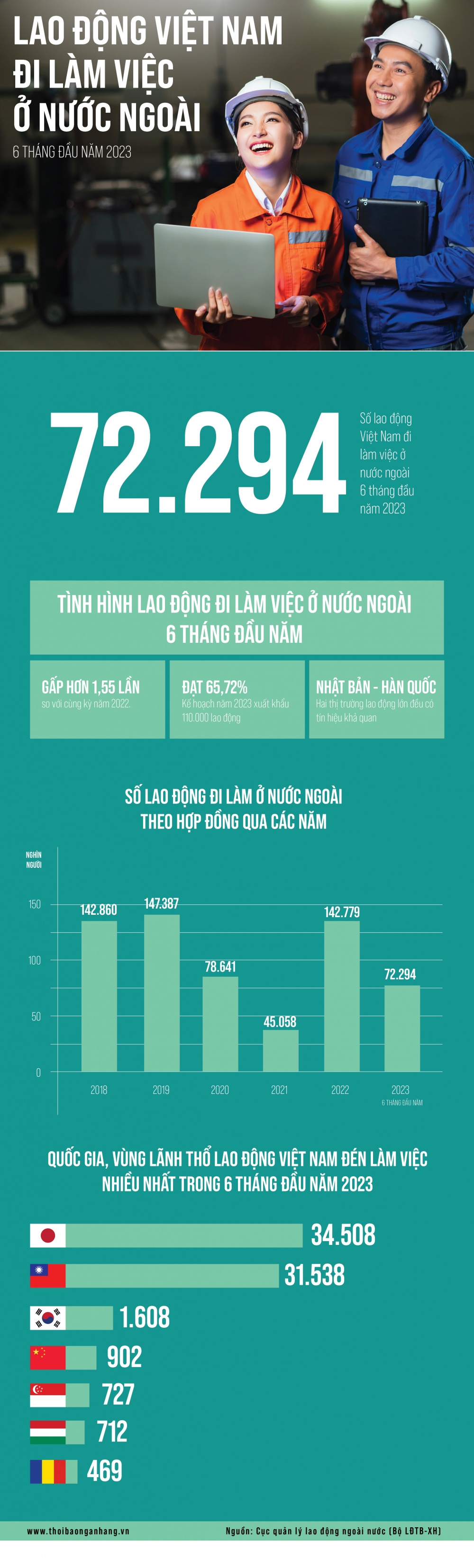 Theo Cục Quản lý lao động ngoài nước (Bộ Lao động - Thương binh và Xã hội), 6 tháng đầu năm 2023, tổng số lao động Việt Nam đi làm việc ở nước ngoài là 72.294 người, đạt hơn 65% kế hoạch cả năm.