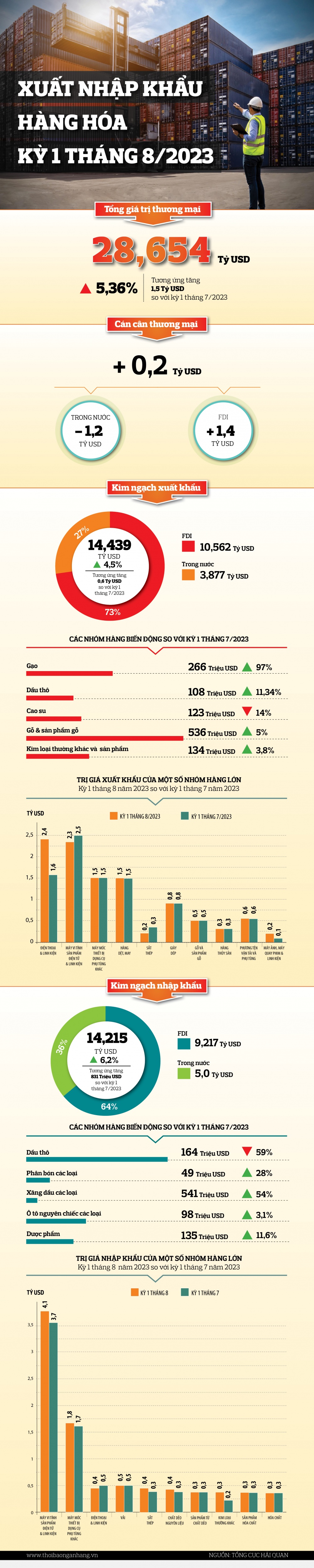 Tổng kim ngạch xuất, nhập khẩu hàng hóa kỳ 1 tháng 8/2023 đạt 28,654 tỷ USD, tăng 5,36% so với cùng kỳ tháng trước, trong đó xuất khẩu tăng 4,5%; nhập khẩu tăng 6,2%.