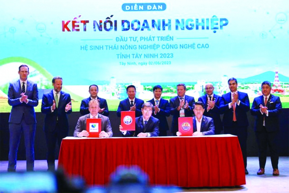 | Trong khuôn khổ Diễn đàn kết nối doanh nghiệp đầu tư, phát triển hệ sinh thái nông nghiệp công nghệ cao tỉnh Tây Ninh năm 2023, De Heus Việt Nam (Hà Lan) và Tập đoàn Hùng Nhơn cam kết sẽ đầu tư một số dự án lĩnh vực nông nghiệp ứng dụng công nghệ cao với tổng vốn đầu tư khoảng 2.500 tỷ đồng; BaF Việt Nam cam kết thực hiện dự án tổ hợp sản xuất và chế biến thịt với tổng vốn đầu tư 600 tỷ đồng; Vinamilk cam kết thực hiện dự án Tổ hợp nhà máy sữa và trang trại bò sữa vốn đầu tư 1.500 tỷ đồng. Bên cạnh đó, liên doanh giữa De Heus và Hùng Nhơn sẽ đầu tư sản xuất 10.000 heo giống, 200.000 heo nái thương phẩm tại Tây Nguyên và Đông Nam bộ, đồng thời sẽ phấn đấu phát triển 58 triệu con gà giống và 25 triệu con gà thịt tại Tây Ninh. |