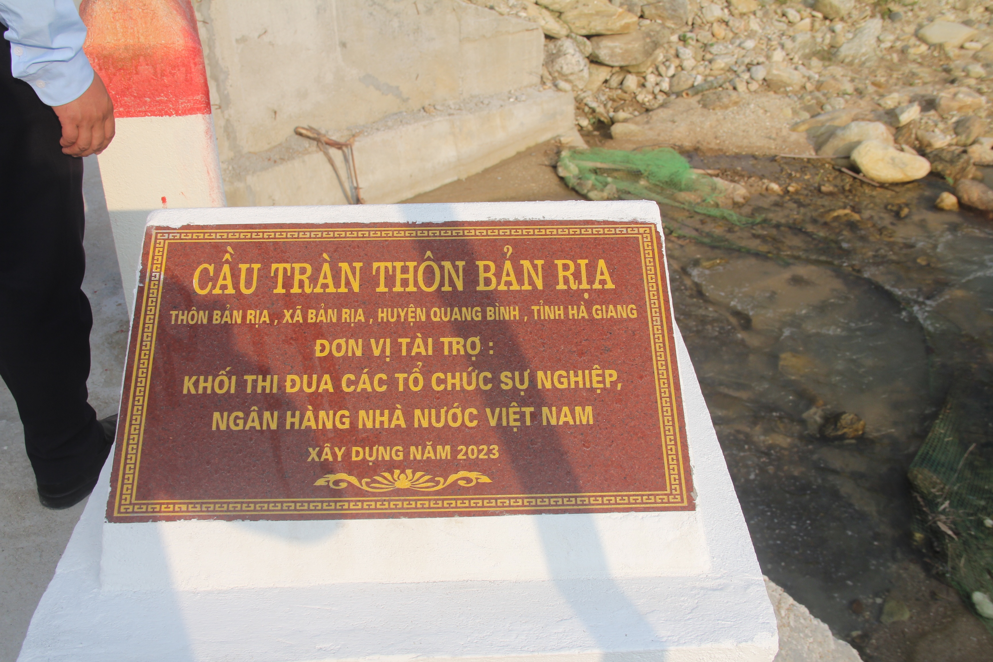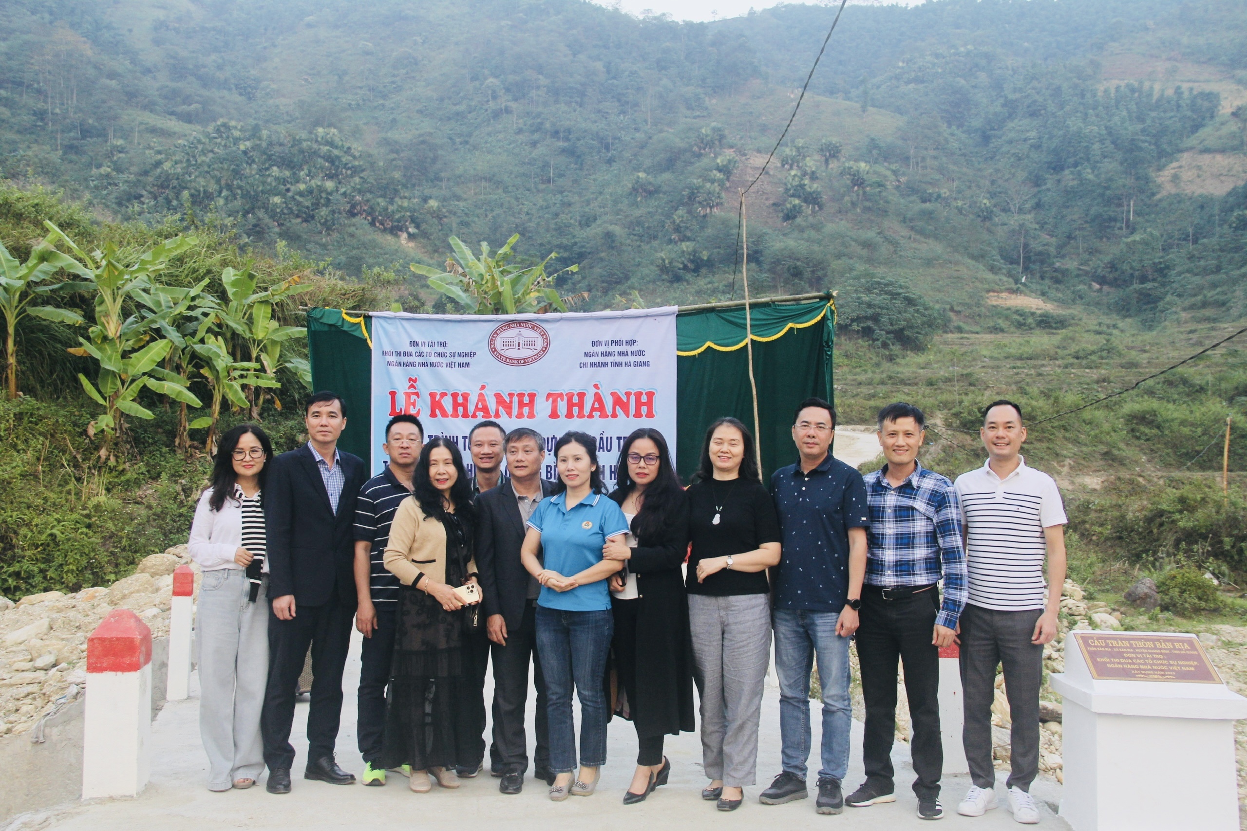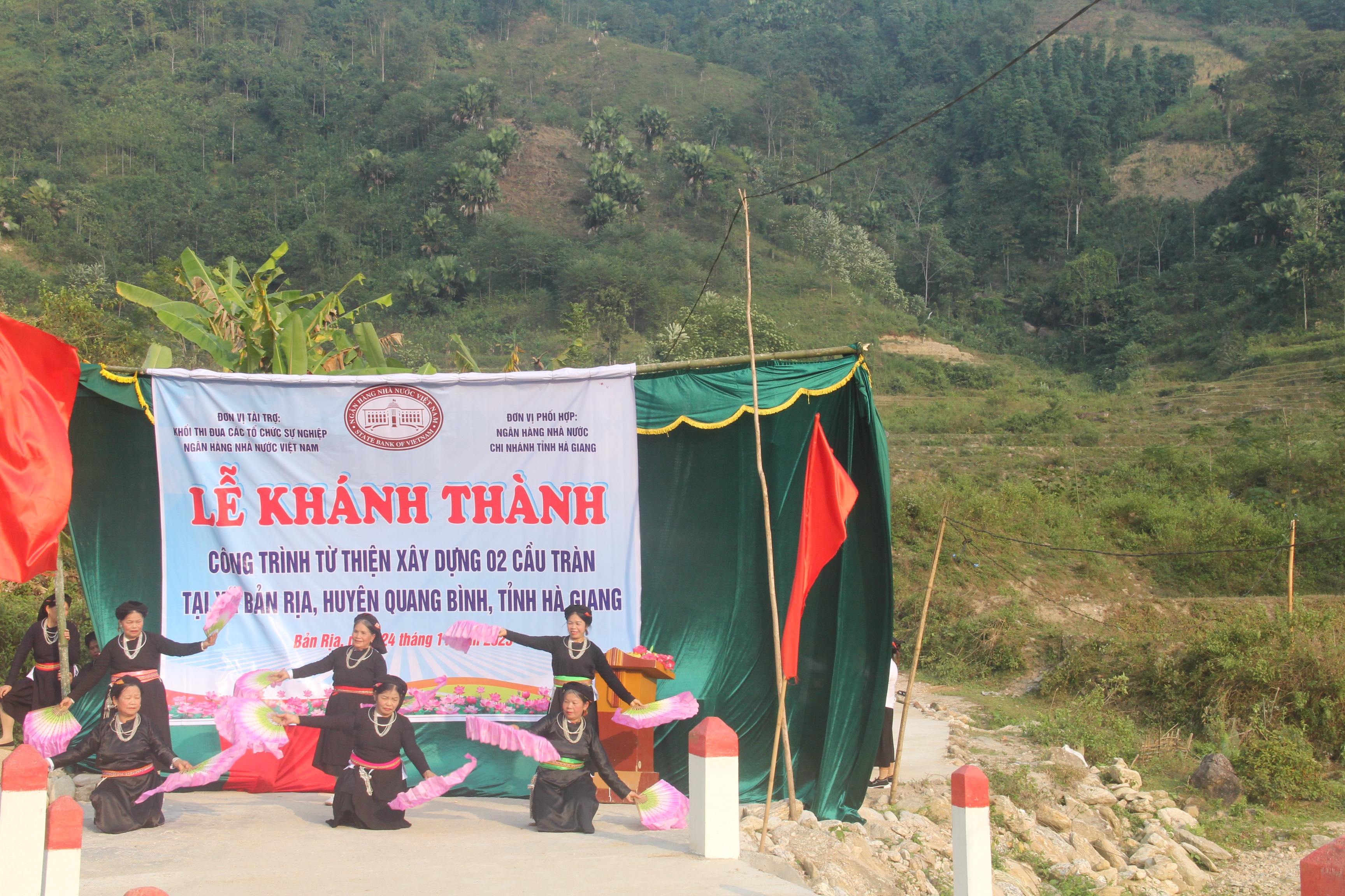 Tại buổi lễ, ông Nguyễn Công Sự, Phó Bí thư Thường trực Huyện ủy, Chủ tịch HĐND huyện Quang Bình; ông Lê Thái Nam, Bí thư Đảng ủy, Chủ tịch hội đồng thành viên Nhà máy In tiền Quốc gia; ông Nguyễn Ngọc Hải, Giám đốc Ngân hàng Nhà nước chi nhánh tỉnh Hà Giang cùng lãnh đạo các đơn vị thuộc Khối thi đua các Tổ chức sự nghiệp NHNN thực hiện nghi thức cắt băng khánh thành 2 cầu tràn tại xã Bản Rịa, huyện Quang Bình.