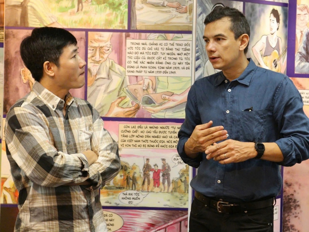 | Họa sĩ, tác giả Clément Baloup (phải) và nhà nghiên cứu văn học Lê Nguyên Long (trái) cùng nhau trò chuyện về tác phẩm mới. |