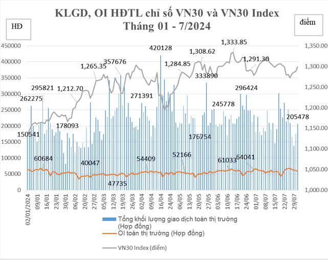 Khối lượng hợp đồng mở (OI) tại ngày giao dịch cuối tháng 7 đạt 58.601 hợp đồng, giảm 8,49% so với tháng trước. Trong đó, phiên giao dịch ngày 25/7/2024 có khối lượng mở OI cao nhất trong tháng, đạt 68.049 hợp đồng.
