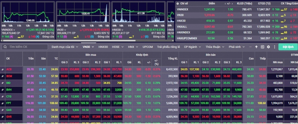 Phiên giao dịch ngày 7/5 khép lại với sự hứng khởi trên toàn thị trường. VN-Index tăng 8,42 điểm, tương ứng 0,68%, lên 1.250,37 điểm, với gần 762 triệu cổ phiếu được giao dịch, tương đương 17.199 tỷ đồng. Chỉ số HNX-Index cũng ghi nhận mức tăng nhẹ 0,52 điểm lên 213,41 điểm, trong khi UPCOM-Index giảm nhẹ 0,02 điểm xuống 92,92 điểm.