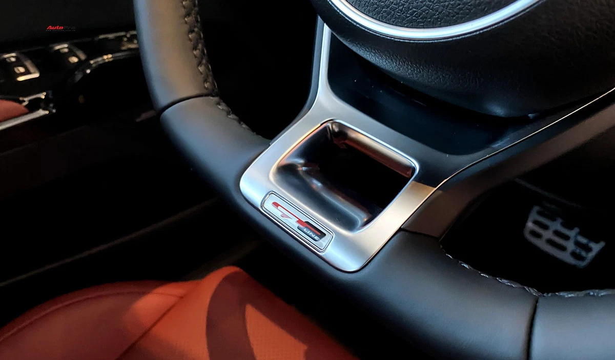 Mẫu sedan cao cấp của Kia dùng vô-lăng 3 chấu dạng vát đáy với logo GT-Line tạo điểm nhấn. Phía sau là cụm đồng hồ điện tử 12,3 inch với khả năng hiển thị đa thông tin, thay đổi chế độ, màu sắc tùy thuộc vào người lái.