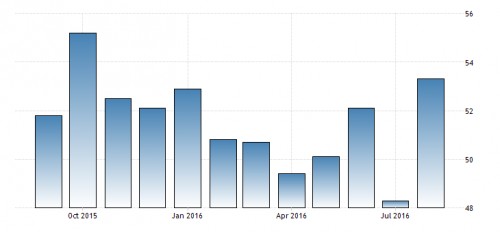 Tuy nhiên, tác động này chỉ mang tính tạm thời, ngay trong tháng 8, chỉ số PMI đã tăng mạnh trở lại lên mức 53,3 điểm nhờ sự gia tăng mạnh số lượng đơn đặt hàng mới và các công ty tiếp tục báo cáo khả quan về số lao động mới được tuyển dụng. Như vậy, đây là lần tăng điểm mạnh nhất của chỉ số PMI trong vòng 25 năm qua và cũng là tháng PMI đạt mức cao nhất kể từ tháng 10 năm 2015 trở lại đây.