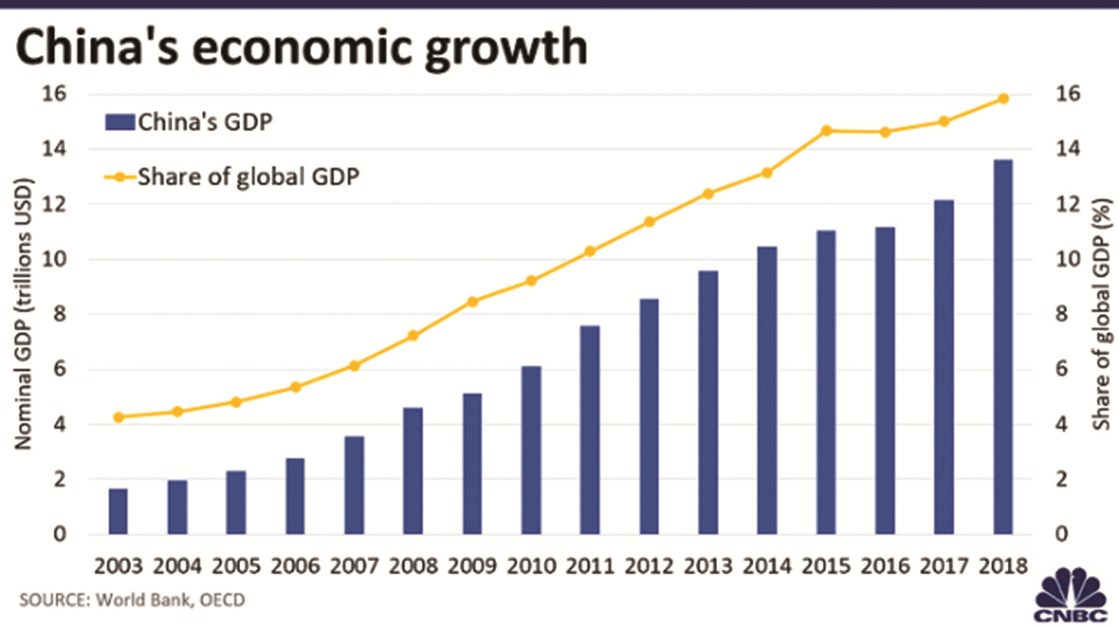 Kể từ năm 2003, Trung Quốc đã phát triển từ nền kinh tế lớn thứ sáu thế giới lên mức lớn thứ hai như hiện nay, chỉ đứng sau Mỹ. Trung Quốc được xem là một trong những động lực tăng trưởng chính trên toàn thế giới. Quỹ Tiền tệ Quốc tế ước tính, chỉ riêng Trung Quốc đã chiếm 39% sự mở rộng của kinh tế toàn cầu trong năm 2019.