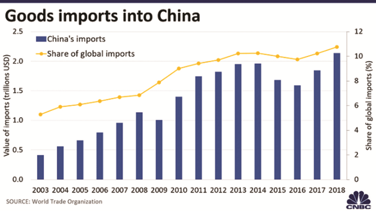 Về mặt thương mại, dữ liệu của Tổ chức Thương mại Thế giới cho thấy, nhu cầu gia tăng trong phạm vi Trung Quốc đã đưa nước này trở thành nhà nhập khẩu lớn thứ hai thế giới kể từ năm 2009. Hiện Trung Quốc là nhà nhập khẩu lớn nhất các mặt hàng như dầu, quặng sắt và đậu nành, cũng như các bộ phận điện tử như mạch tích hợp.