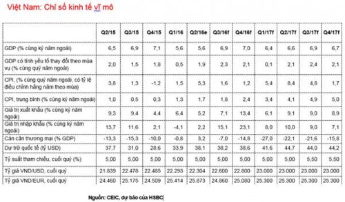 Theo đó, Việt Nam rất khó đạt được chỉ tiêu tăng trưởng kinh tế đề ra của năm nay. Trong báo cáo lần này, HSBC vẫn giữ nguyên dự báo tăng trưởng GDP cho năm 2016 và 2017 lần lượt ở mức 6,3% và 6,6%.