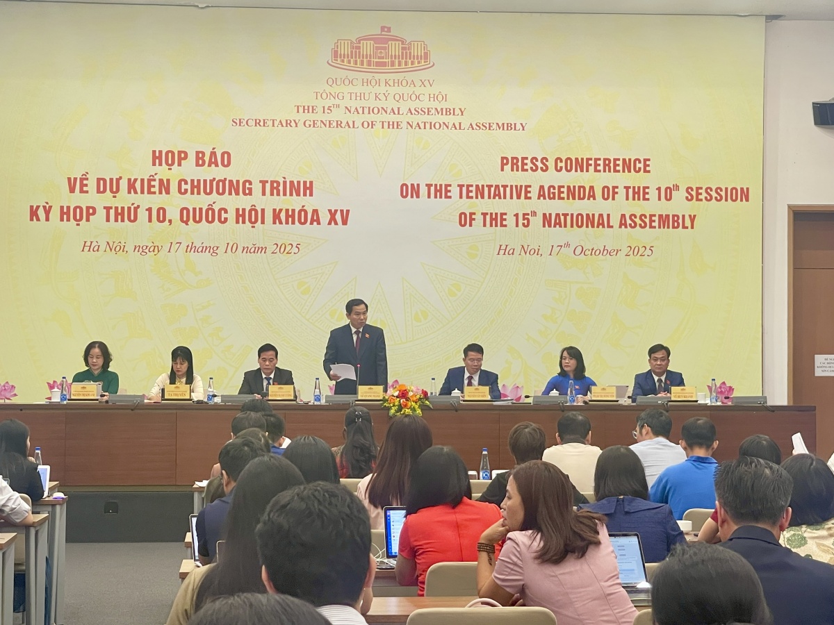 Chiều nay (17/10), Văn phòng Quốc hội đã tổ chức Họp báo Thông tin về Kỳ họp thứ 10, Quốc hội khóa XV. Theo đó, Kỳ họp thứ 10, Quốc hội khóa XV họp phiên trù bị, khai mạc vào sáng ngày 20/10/2025 và dự kiến bế mạc vào ngày 11/12/2025 tại Nhà Quốc hội, Thủ đô Hà Nội. Thời gian làm việc của Kỳ họp dự kiến là khoảng 40 ngày.