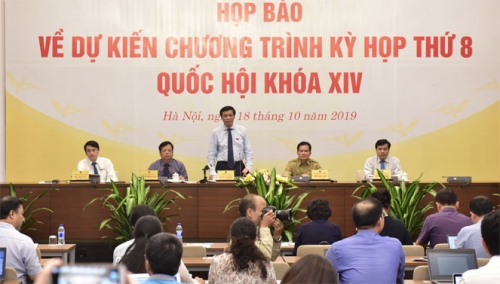 Theo thông tin tại buổi họp báo, Kỳ họp thứ 8 Quốc hội khóa XIV khai mạc ngày 21/10/2019 tại Thủ đô Hà Nội. Tại kỳ họp này, Quốc hội sẽ làm việc trong 28 ngày, dành hơn 60% thời gian cho công tác xây dựng pháp luật. Trong đó, Quốc hội sẽ xem xét, thông qua nhiều dự án Luật quan trọng gồm: dự án Bộ luật Lao động (sửa đổi); dự án Luật sửa đổi, bổ sung một số điều của Luật Tổ chức Chính phủ và Luật Tổ chức chính quyền địa phương; dự án Luật sửa đổi, bổ sung một số điều của Luật Cán bộ, Công chức và Luật Viên chức; dự án Luật sửa đổi, bổ sung một số điều của Luật Kiểm toán nhà nước.