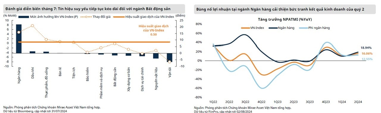 Theo Mirae Asset, phần lớn tăng trưởng trong lợi nhuận được bổ trợ bởi sự bùng nổ kết quả kinh doanh của nhóm Ngân hàng khi ghi nhận tăng trưởng gần 19% so cùng kỳ và 4,1% so quý trước. Bên cạnh là nhóm Nguyên vật liệu (dẫn dắt bởi cổ phiếu HPG khi công bố NPATMI quý 2 tăng trưởng 127% so cùng kỳ và 16% so quý trước) và Bán lẻ (chủ yếu đến từ cổ phiếu MWG với tăng trưởng NPATMI gấp 15 lần so với cùng kỳ và 23% so quý trước).
