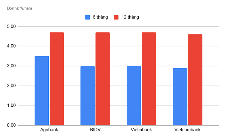 | Lãi suất huy động các kỳ hạn 6 và 12 tháng tại 4 ngân hàng thương mại nhà nước |