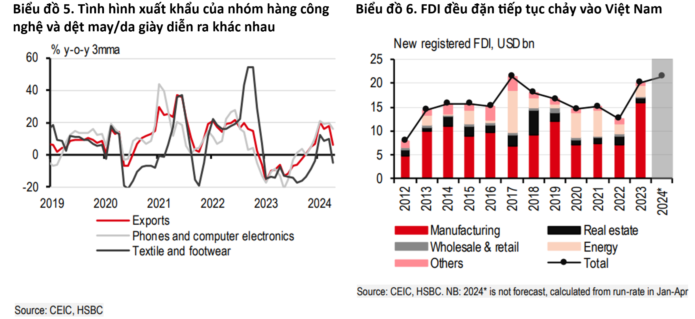 Báo cáo đánh giá, Việt Nam tiếp tục chặng đường phục hồi không mấy bằng phẳng trong tháng 4, phần nào phản ánh mức độ bất ổn cao của môi trường toàn cầu. Điều đáng khích lệ là xuất khẩu tăng 10,6% so với cùng kỳ năm trước, chủ yếu nhờ nhóm hàng điện tử (+20% so với cùng kỳ). Tuy nhiên, những rủi ro bên ngoài khiến tâm lý trong ngắn hạn trở nên tương đối cẩn trọng, bất chấp lòng tin vào sự phục hồi gia tăng nhờ tính chu kỳ trong thương mại toàn cầu. Một số nhà xuất khẩu đã ghi nhận những mối lo ngại bắt nguồn từ gián đoạn ở Biển Đỏ trong thương mại với châu Âu. Không bất ngờ khi xuất khẩu dệt may và da giày vốn có điểm đến chính là châu Âu đã ngưng phục hồi, giảm gần 3% so với cùng kỳ năm trước.