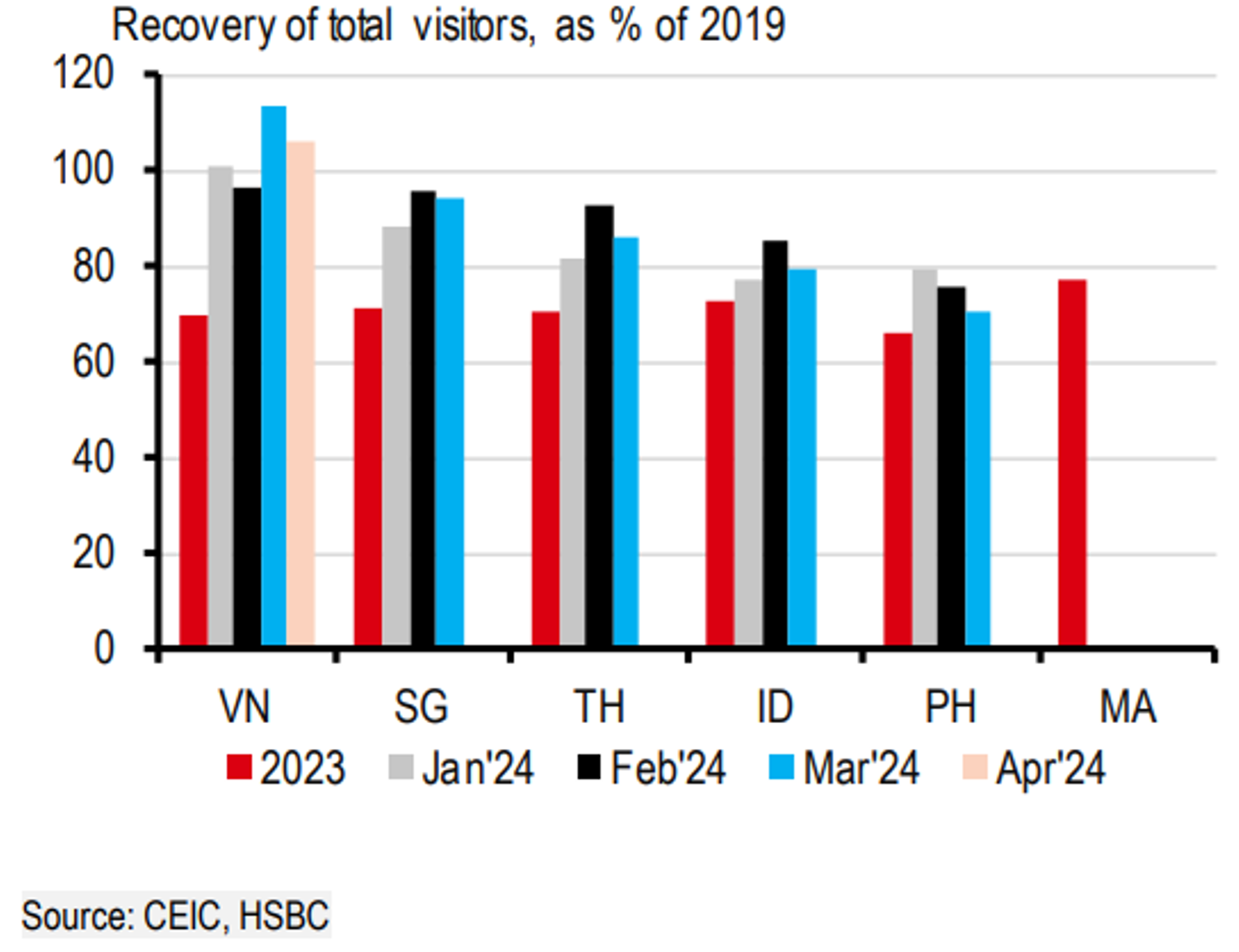 Trong khi nhu cầu hàng hóa vẫn đang phục hồi dần, nhu cầu đối với dịch vụ du lịch đã gia tăng. Một phần là nhờ chính sách nới lỏng thị thực năm ngoái, Việt Nam đã đón tổng cộng hơn 6 triệu lượt khách quốc tế từ đầu năm tới nay, cho thấy mục tiêu 17-18 triệu khách tới cuối năm hoàn toàn nằm trong tầm tay. Trên thực tế, Việt Nam có tỷ lệ phục hồi hàng tháng cao nhất ở ASEAN kể từ tháng 2.