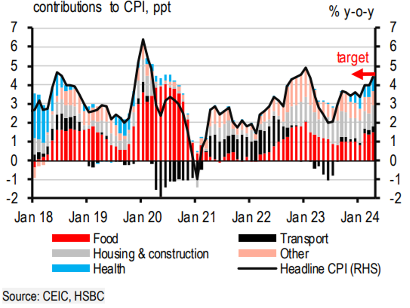 Ngoài ra, lạm phát dường như đã trở thành một vấn đề sát sườn. Lạm phát toàn phần tháng 4 tăng gần 0,1% so với tháng trước, đẩy lạm phát so với cùng kỳ lên 4,4%, tương đương với dự báo của thị trường (HSBC: 4,4%; BBG: 4,4%). Đây là lần đầu tiên trong hơn một năm rưỡi lạm phát tăng đến gần mức 4,5%.