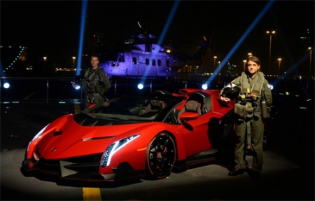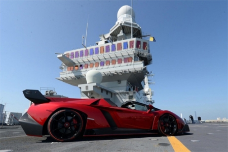 Trái với các màn giới thiệu thường diễn ra tại những nơi an toàn và vững chãi, lần này Lamborghini chọn một bối cảnh khá mạo hiểm. Trên sân khấu là một chiếc hàng không mẫu hạm, phiên bản mui trần của Veneno coupe khoe thiết kế hầm hố, dữ dằn cùng khối động cơ 6,5 lít V12 công suất 750 mã lực.