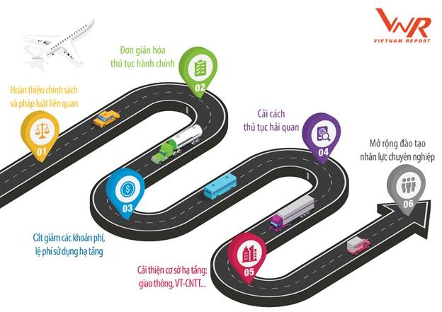 Các chuyên gia và doanh nghiệp trong ngành trong khảo sát của Vietnam Report đã đưa ra một số giải pháp khuyến nghị để phát triển ngành, trong đó ưu tiên vào ba khía cạnh: (1) Hoàn thiện chính sách và pháp luật liên quan đến hoạt động logistics, đơn giản hóa thủ tục hành chính, cải cách thủ tục hải quan, cắt giảm các khoản phí, lệ phí sử dụng hạ tầng; (2) Cải thiện cơ sở hạ tầng: giao thông, viễn thông và công nghệ thông tin; (3) Mở rộng đào tạo mạng lưới đào tạo nhân lực trong ngành logistics.