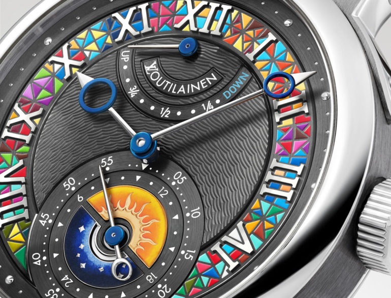 Vòng tròn giờ lấy cảm hứng từ kính màu, được nghệ nhân Maryna Bossy vẽ tay trong 32 giờ với 28 màu sắc khác nhau. Mặt số phụ GMT tại vị trí 6 giờ khắc họa mặt trời và mặt trăng, tô điểm bằng màu nghệ tây và xanh lam đặc trưng của Louis Vuitton.