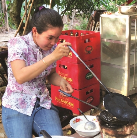 Nếu như ông Đính nhìn cử chỉ của khách nước ngoài để đoán ý thì chị Vân trò chuyện với khách được chút chút, câu nào nghe không được thì chị nói khách viết ra giấy, rồi chị viết lại trả lời. Trước nhà chị Vân có vườn tre khá đẹp. Gia đình chị Vân có thêm nghề đan thúng, rổ tre. Từ khi làm du lịch, khách đến chơi thường xuyên, người nhà chị Vân bày vật liệu ra đan dưới tán tre xanh mát cho khách chụp ảnh lưu niệm.