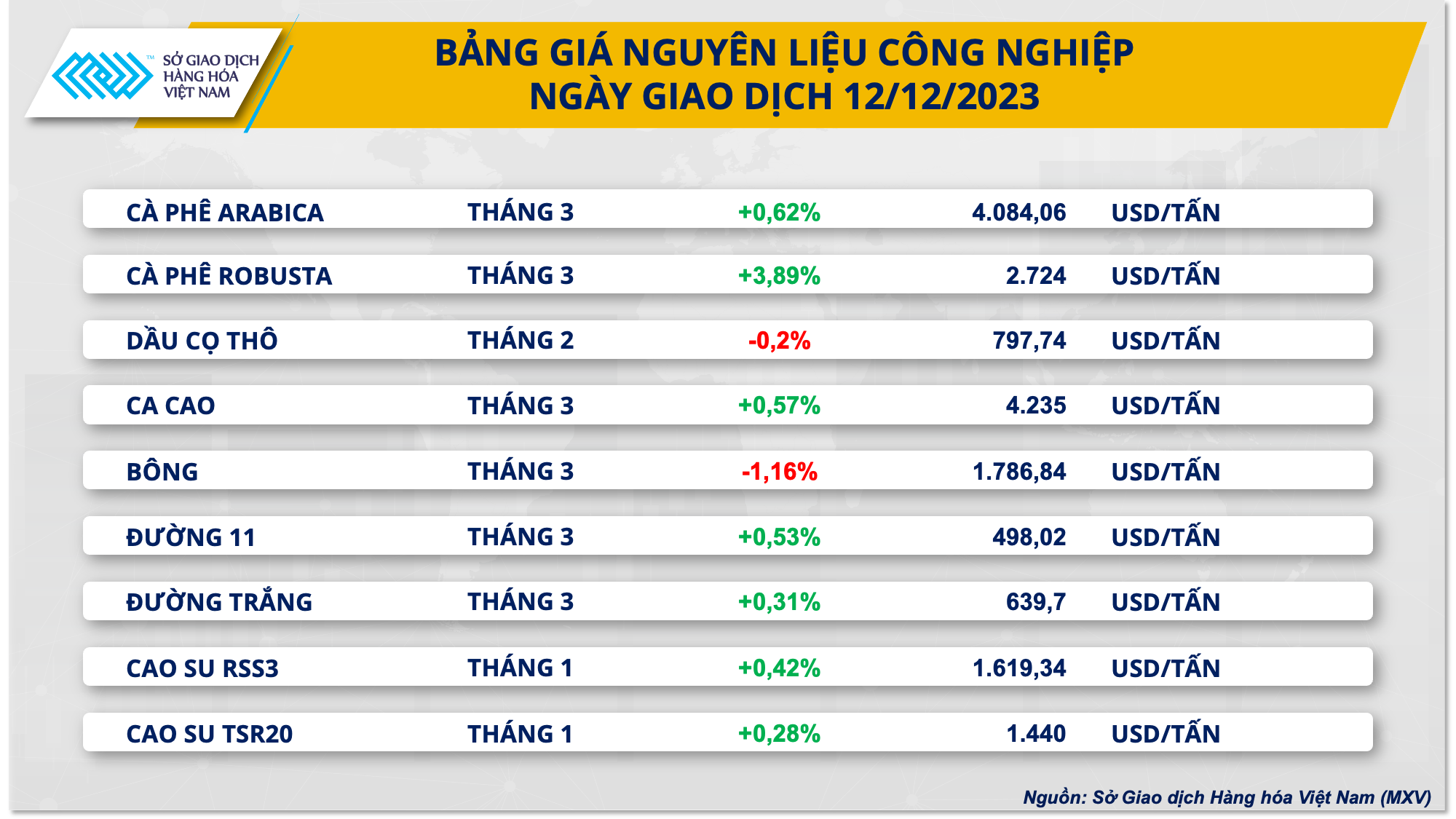 Đáng chú ý, giá dầu lao dốc kết thúc chuỗi tăng ba phiên trước đó và đi xuống mức thấp nhất trong khoảng 5 tháng qua nguyên nhân do lạm phát Mỹ tăng trở lại. Trong khi đó, giá cà phê lên đáng kể bởi tồn kho Robusta trên Sở ICE ở mức thấp và lo ngại thời tiết nắng nóng tại Brazil có thể ảnh hưởng lớn đến sản lượng mùa vụ.
