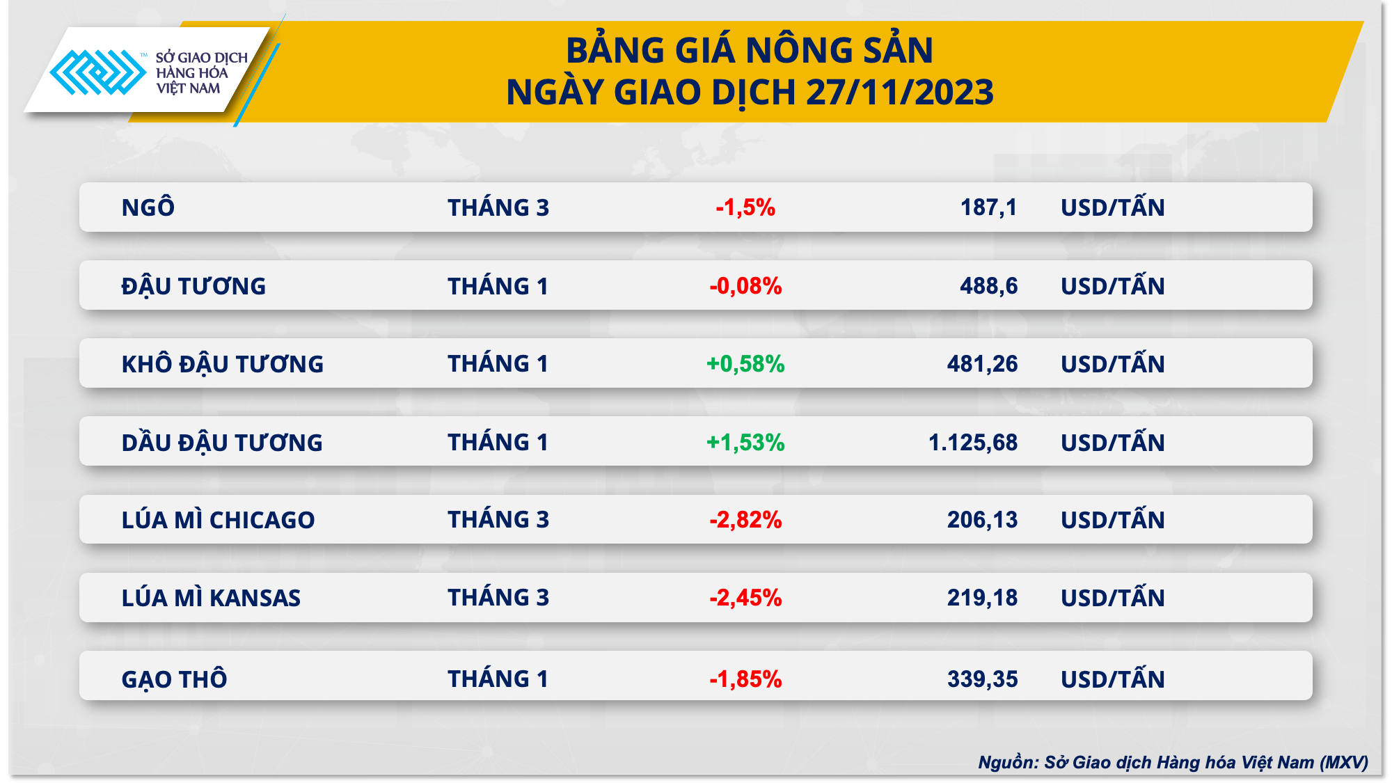 Trong khi đó, dầu đậu là mặt hàng tăng mạnh nhất trong nhóm khi nhảy vọt hơn 1,5%. Theo Intertek Testing Services, Malaysia đã xuất khẩu 1,26 triệu tấn sản phẩm dầu cọ trong 25 ngày đầu tháng 11, tăng 13,6% so với cùng kỳ tháng 10.