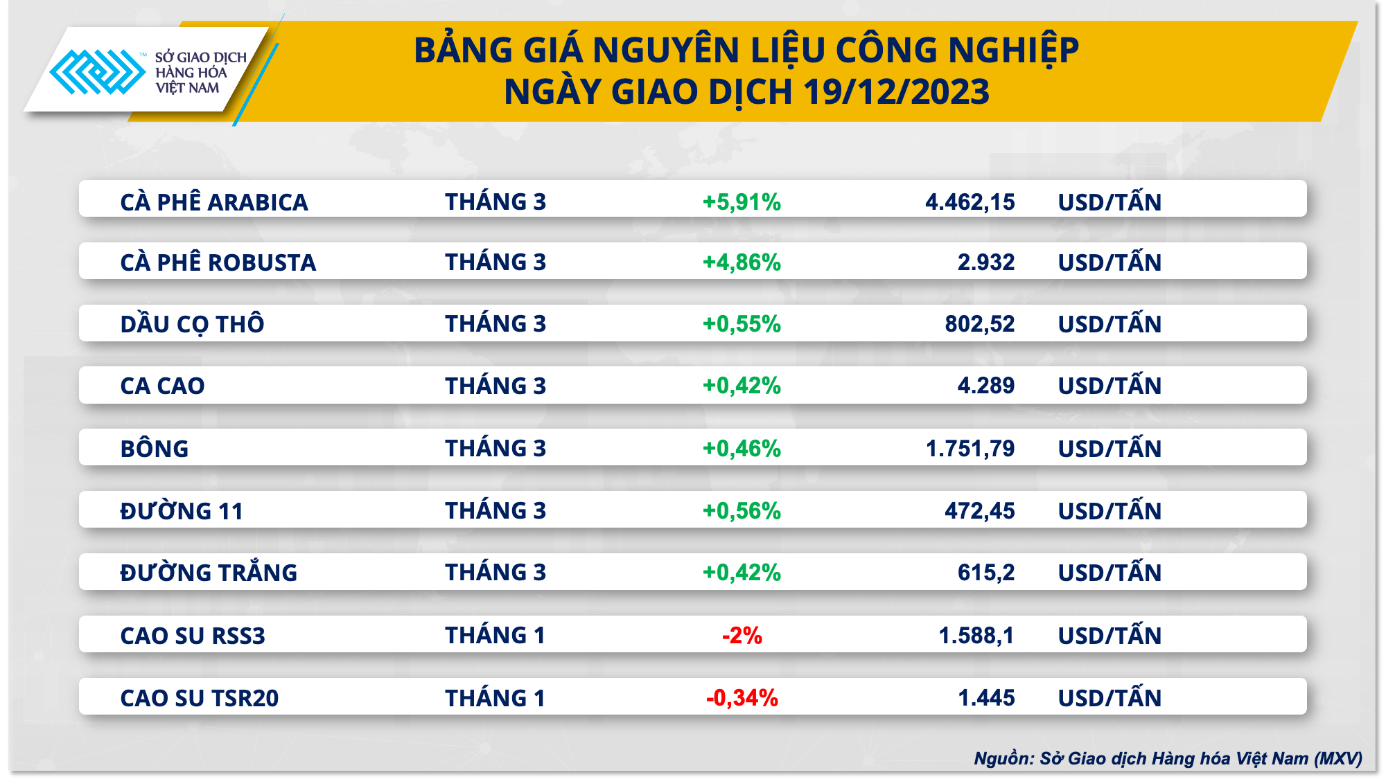 Khép lại phiên giao dịch 19/12, giá Robusta tăng 4,86%, lên mức cao nhất trong 28 năm, giá Arabica cũng chạm mức đỉnh trong 8 tháng với lực tăng 5,91% trong phiên hôm qua.