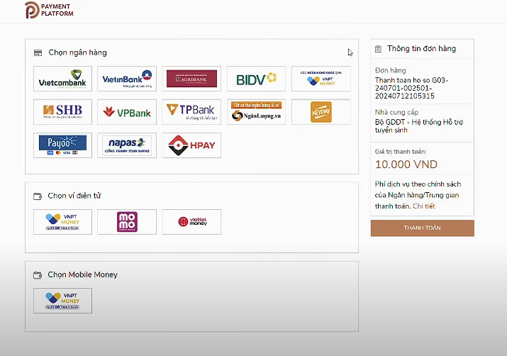 Để việc thao tác thanh toán nhanh, gọn, chính xác thí sinh nên sử dụng các kênh thanh toán có hỗ trợ thanh toán nhanh bằng QR code như: Momo, Ngân lượng,Payoo, Ví VNPT Money, Napas....